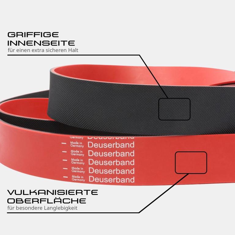 Wir empfehlen dir bei deinem Training das Band nur an stabilen und abrutschsicheren Haltepunkten zu befestigen. Prüfe vor der Übung, dass du mit keinen scharfen Kanten oder rauen Flächen in Berührung kommst. Das Deuser Band® lässt sich leicht mit kaltem/lauwarmem Wasser ohne Seife reinigen.