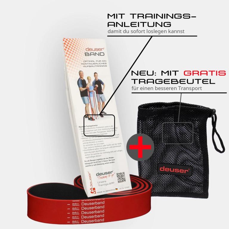 Trainingsanleitung: Damit du direkt loslegen kannst, haben wir eine Trainingsanleitung entwickelt und legen diese dem Deuser Band bei. Wenn du sie einmal nicht griffbereit hast, nutze einfach unsere iOS App. Achte immer auf eine korrekte Ausführung der Übungen.