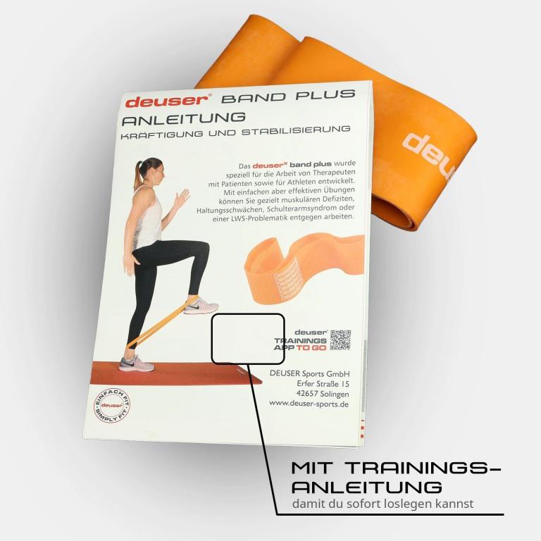 Trainingsanleitung: Damit du direkt loslegen kannst, haben wir eine Trainingsanleitung entwickelt und legen diese dem Deuser Band bei. Wenn du sie einmal nicht griffbereit hast, nutze einfach unsere iOS App. Achte immer auf eine korrekte Ausführung der Übungen.